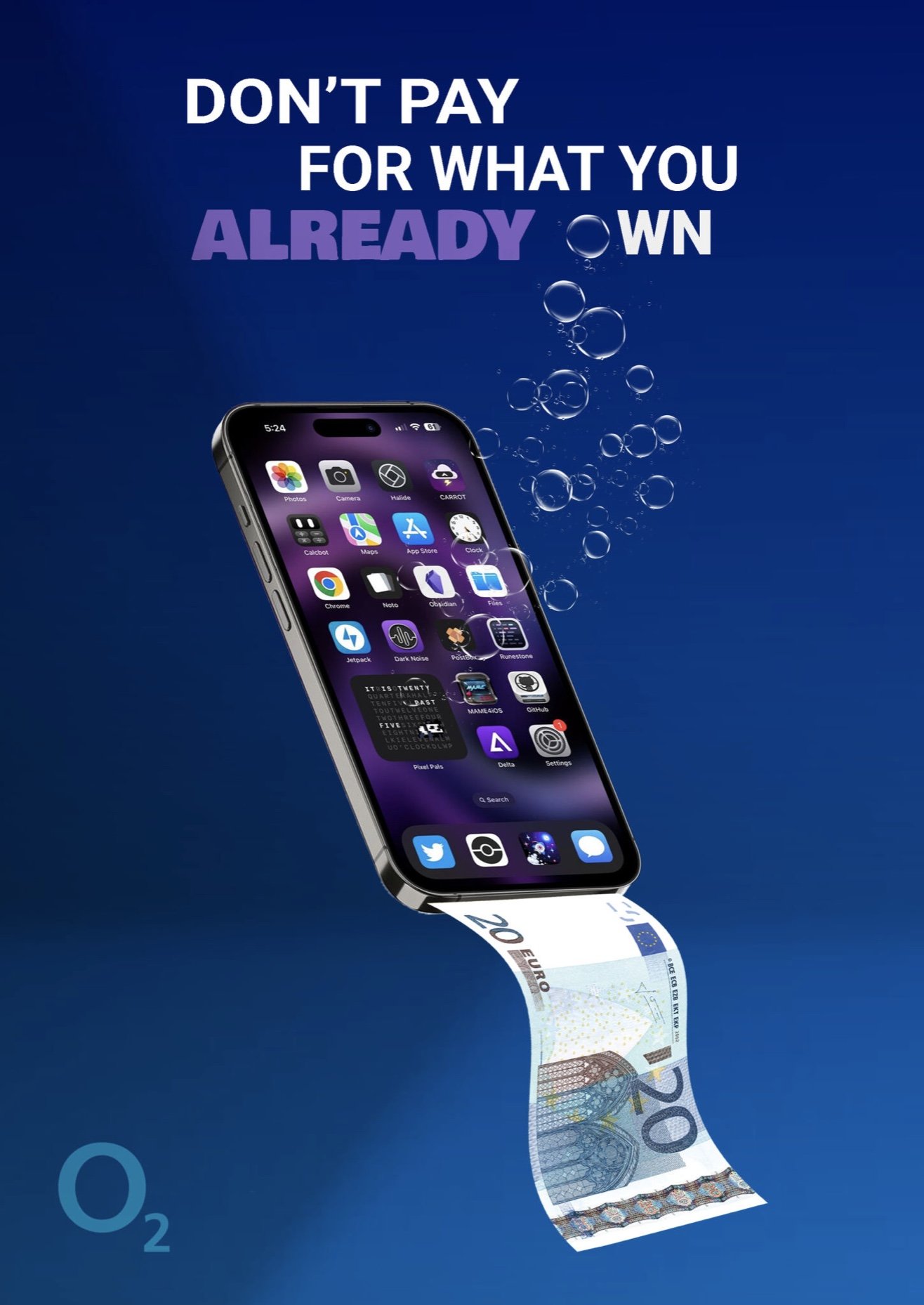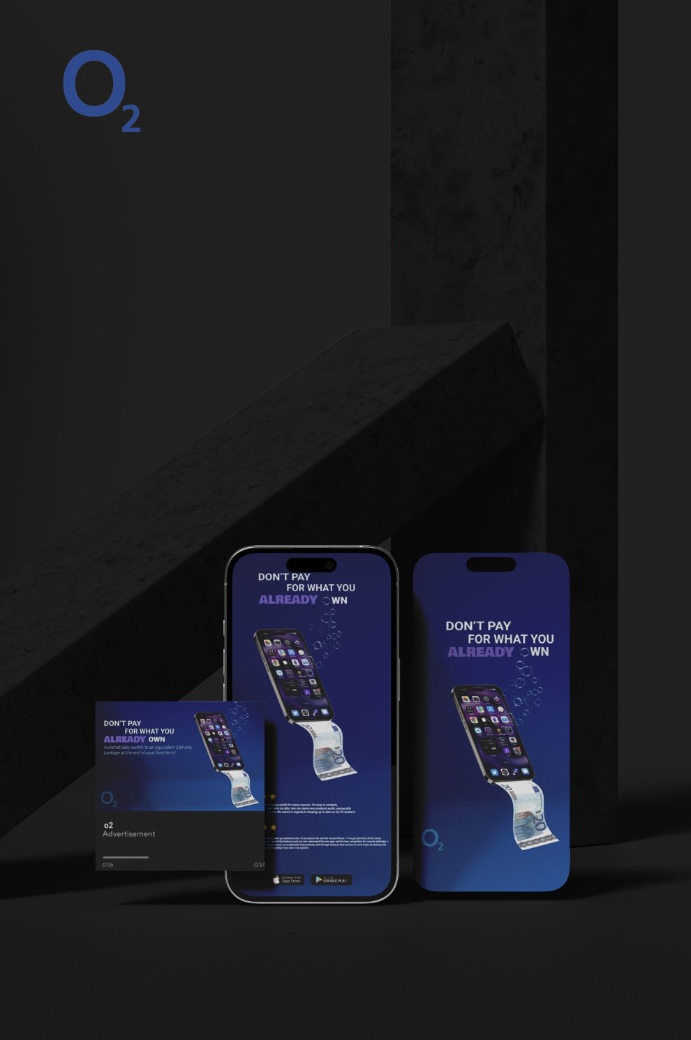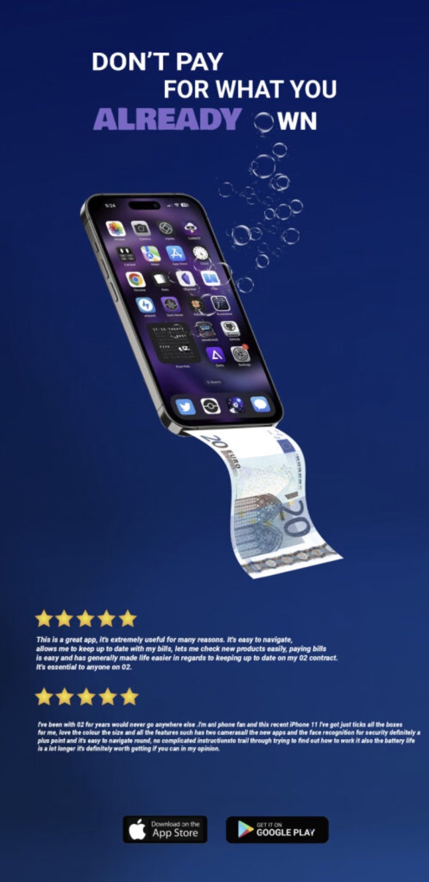 This campaign explores the idea’’ Don’t Pay for what you already own’’ for O2, Focusing on fair pricing and customer value. In this design , I focused on showing saving through smartphone and money imagery, using O2’s blue and bubble elements to strengthen the brand identity.